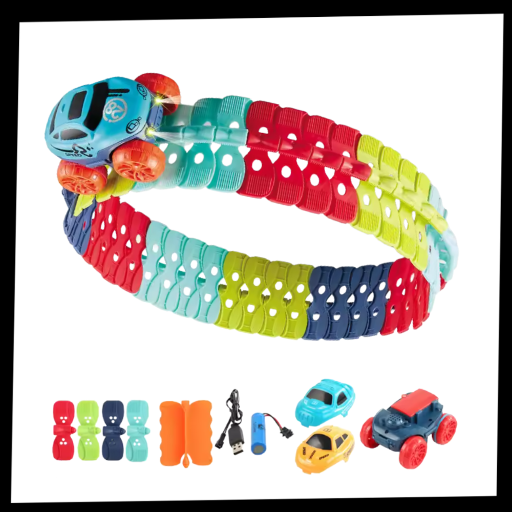 The Mini Roller Coaster Race Track – Ignite your child’s imagination with this thrilling 46-piece race track set! Featuring flexible tracks, a power-packed LED race car, and interchangeable shells, it delivers non-stop, roller coaster-style racing fun. are the heart of this racing set’s endless play potential. Each track piece can bend, twist, and curve in any direction, allowing kids to build custom layouts that defy boring straight lines. Whether it’s creating loops, ramps, or winding paths, the flexibility ensures no two races are ever the same. This not only keeps kids engaged longer but also stimulates their creativity and spatial awareness as they problem-solve and construct new courses every time they play.